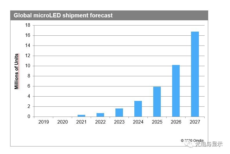 根據(jù)Omdia發(fā)布的《MicroLED顯示技術與市場 ─ 2020》報告,MicroLED顯示器的出貨量增長由智能手表和電視市場的需求引領。Omdia預計2027年智能手表市場的MicroLED顯示器出貨量將超過1000萬片,而同年電視市場的出貨量預計將增長到330萬片以上。