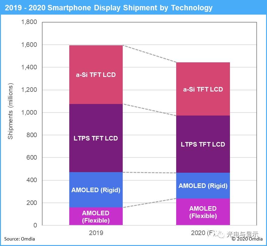 Omdia預計2020年智能手機用AMOLED總出貨量為4.66億片,較2019年同比微降1%。憑借高顯示性能(高對比度和低功耗),AMOLED的出貨量在2019年得到了強勁增長,取代了高端智能手機對LTPS TFT LCD的需求。